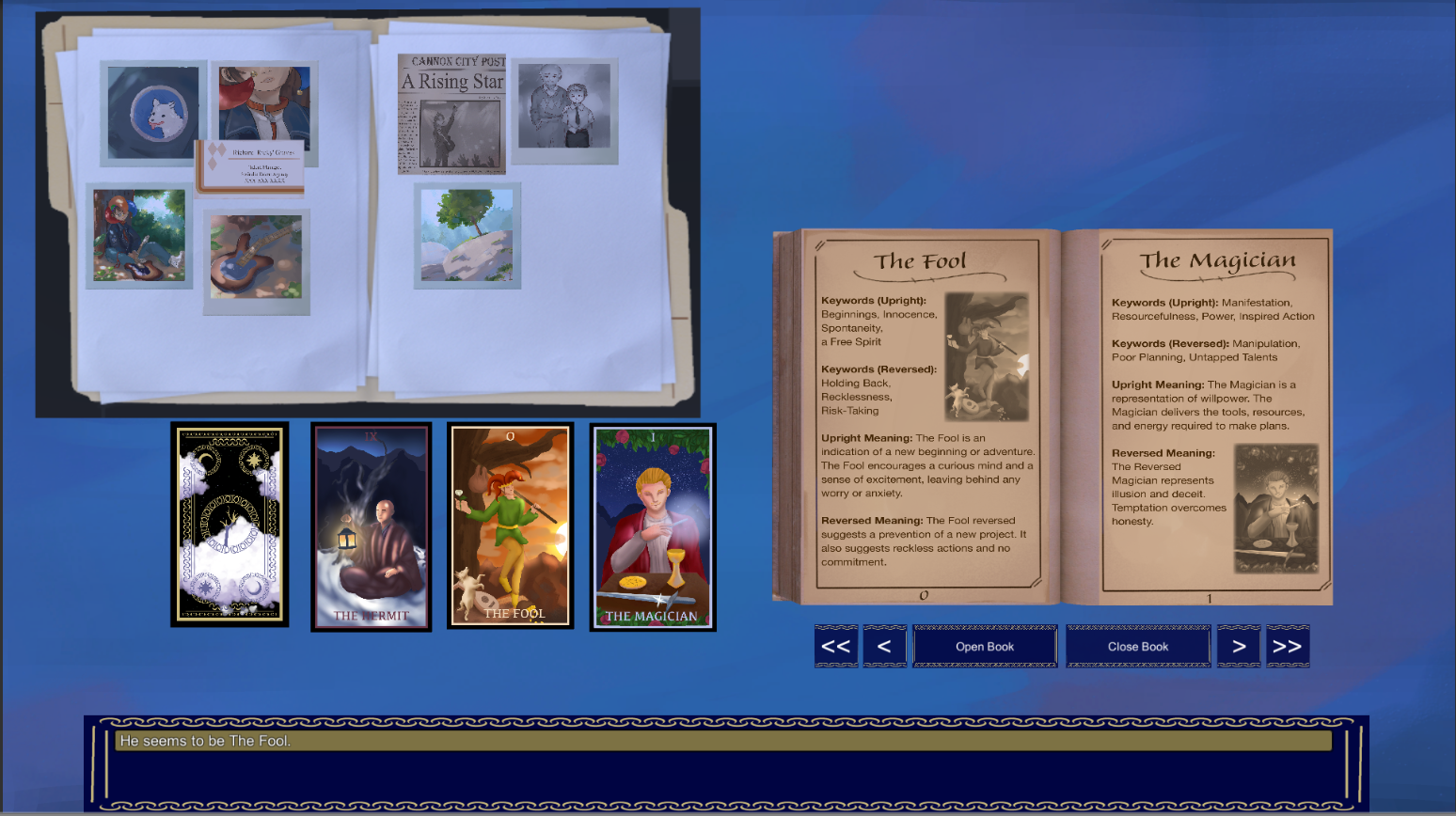 A screenshot of the main gameplay interface. You are to match the evidence from the crime scene photos to one of the tarot cards that have been dealt. There is also a guidebook.