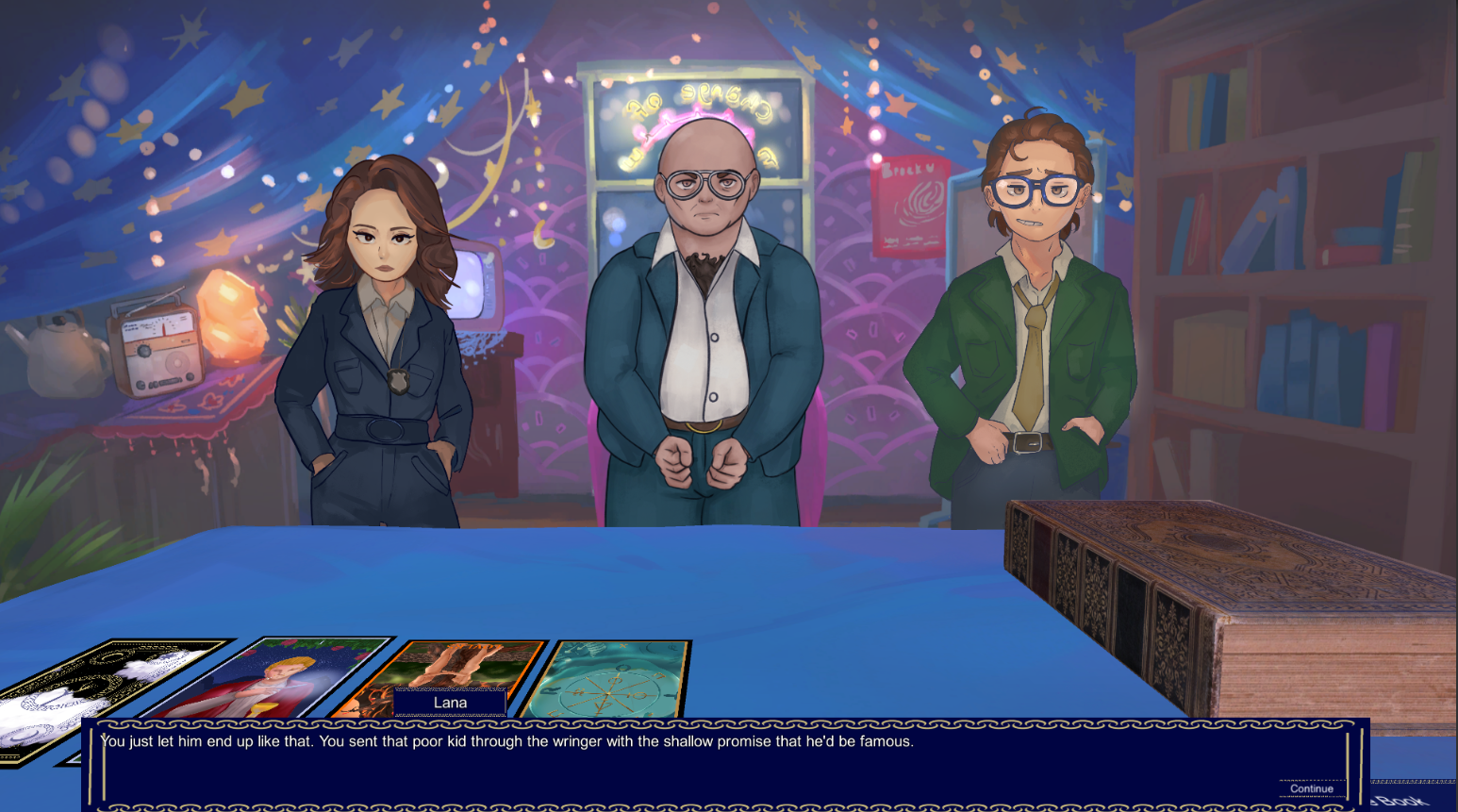 The Hierophant was my capstone project for my final year at Brock University. In September, we agreed to make a murder mystery visual novel game with a little twist, you play as a tarot reader. My role on the team was three-fold. I was lead UX/UI designer, a sound designer and a programmer for the game. I was also the voice actor for Lana who is the lead detective in the story. Juggling all of these roles was stressful at times but so rewarding in the end. Wearing all these different hats and acting as a go between for the art and technical teams was a great way for me to work closely with all of my teammates and bring all our ideas from concept to completion.